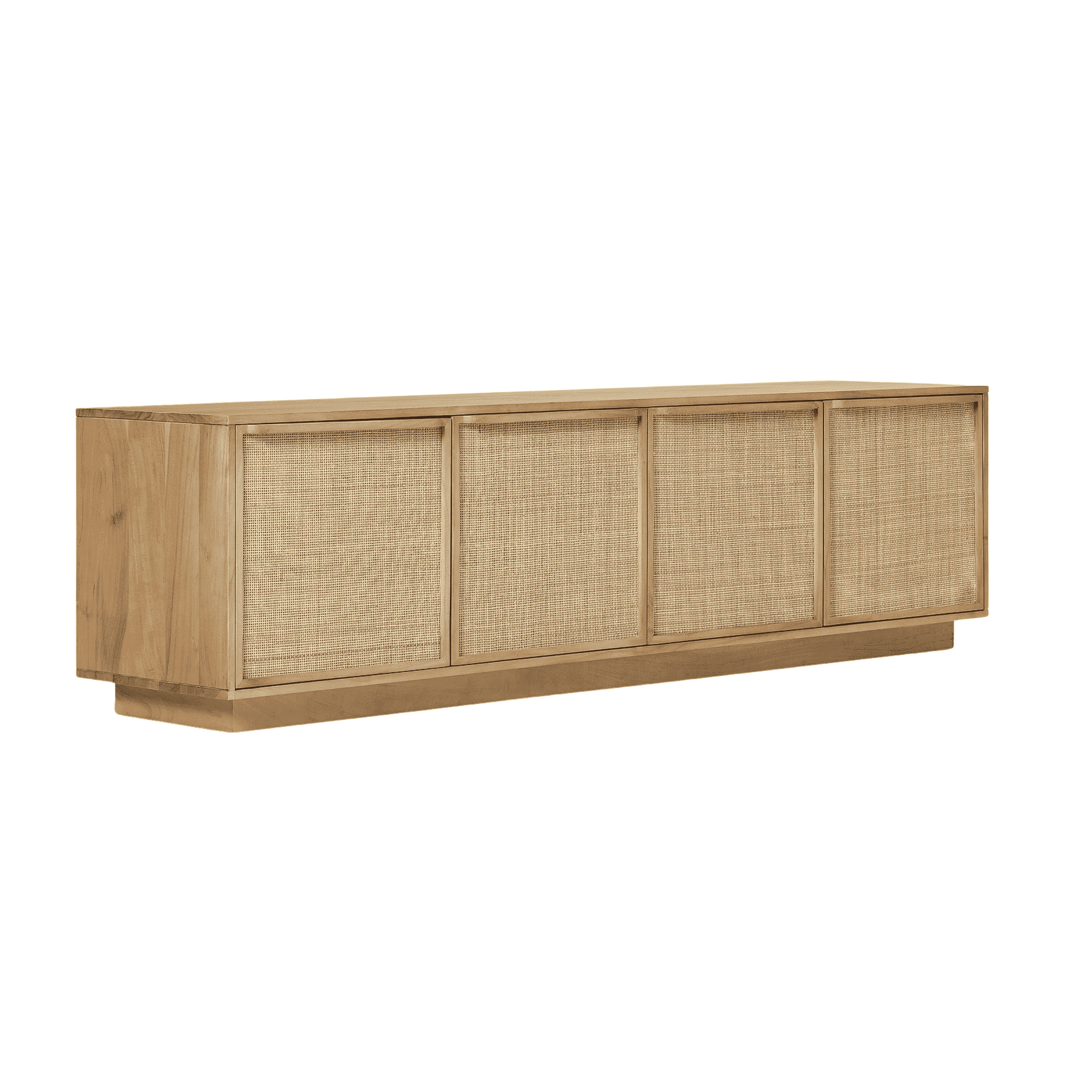 Bring natural elegance into your living space with the Furn Heaven Solara Woven Rattan Media Console. Crafted from warm-toned solid wood and featuring four front panels of handwoven rattan, this piece blends modern minimalism with organic texture. The clean, low-profile silhouette is designed for contemporary interiors, while the earthy tones and woven detailing introduce a calming, coastal charm. Ideal for media storage, its spacious interior keeps electronics and clutter hidden behind its soft-close doors, making it as practical as it is beautiful.