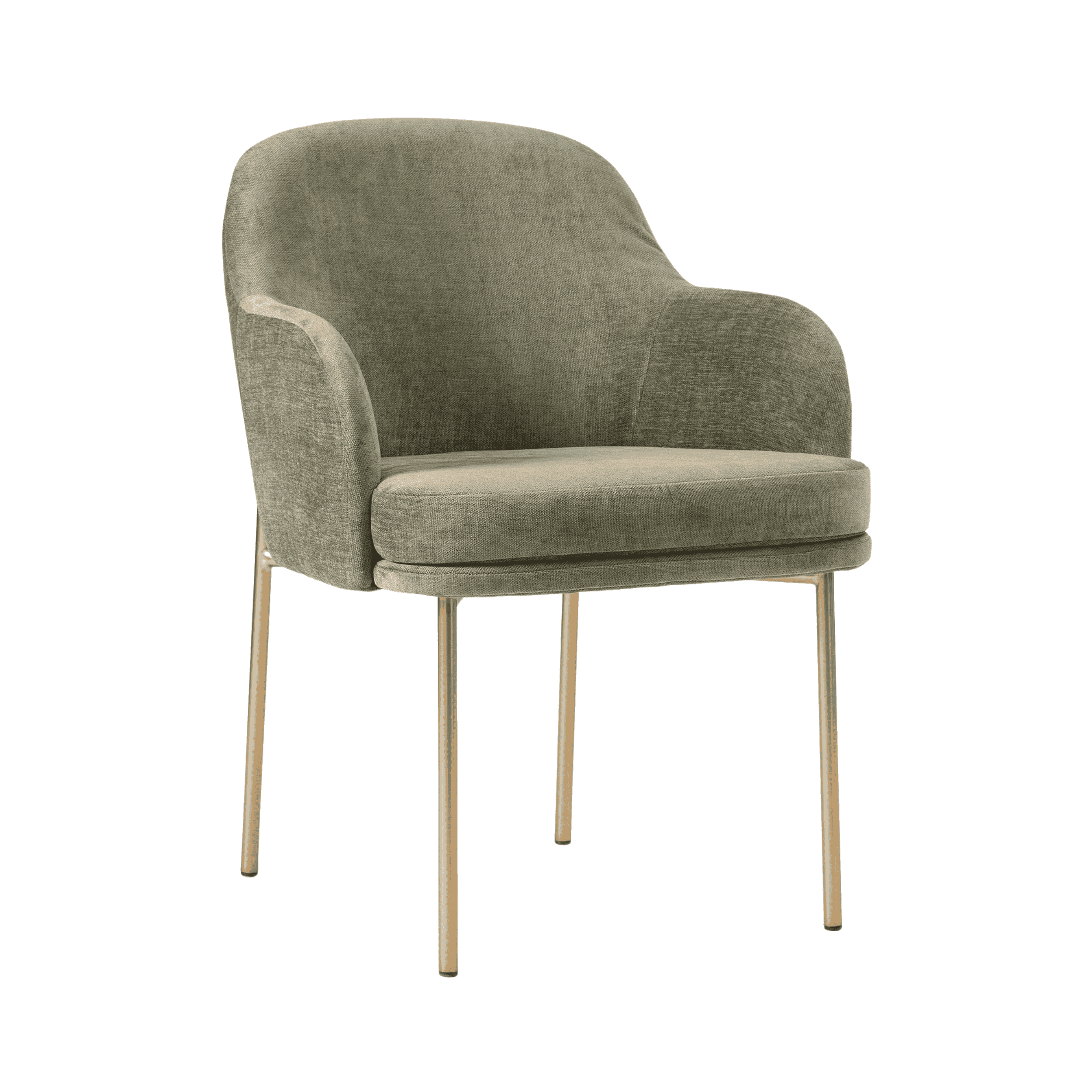 Elevate your dining experience with the Furn Heaven Velvet Luxe Dining Chair. Upholstered in rich, olive green velvet, this chair features a gently curved backrest and arms for a cocooning comfort. The plush seat cushion pairs beautifully with slim, gold-finished metal legs, offering a perfect balance of elegance and durability. Ideal for upscale cafes, dining rooms, or lounge spaces, this piece adds a luxurious touch while ensuring lasting comfort and contemporary style in any setting.