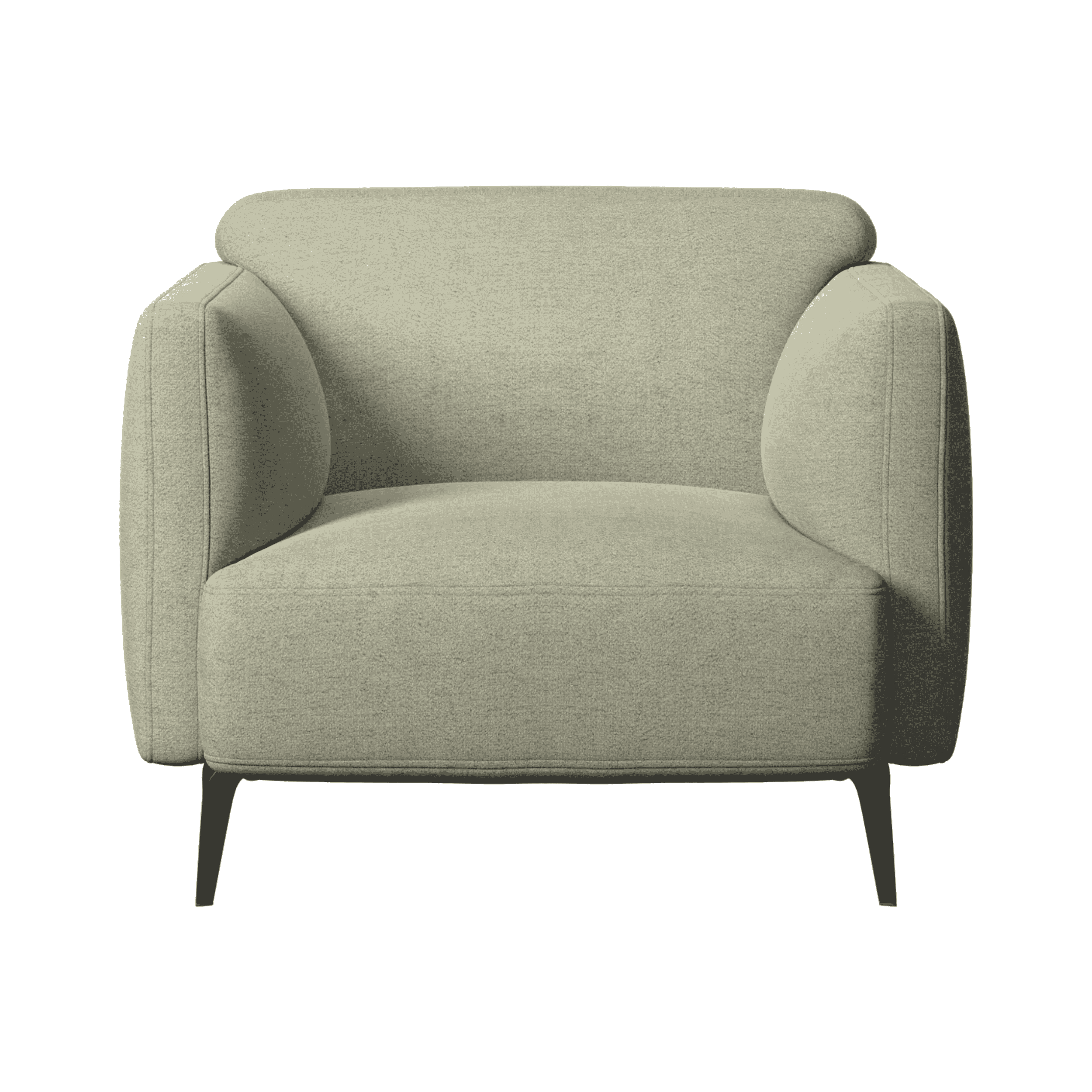 Furn Heaven presents this chic armchair, upholstered in soft sage green fabric that brings a touch of calm to any interior. The rounded armrests and cushioned seat offer relaxed comfort, while slender black legs add a sleek, contemporary contrast. With its refined form and minimalist style, this piece is perfect for modern living rooms, reading nooks, or cozy corners that call for both comfort and elegance.